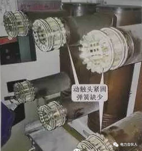 之后,利用停電機(jī)會(huì)調(diào)查隱患。共發(fā)現(xiàn)7條10kV出線開(kāi)關(guān)柜手動(dòng)觸點(diǎn)壓縮彈簧存在上述斷裂隱患(見(jiàn)圖19),因此判定屬于家族缺陷。