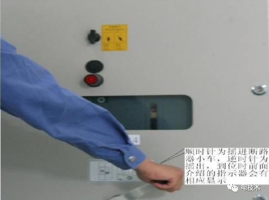 4.將斷路器手車(chē)的搖把插入搖把插座,順時(shí)針轉(zhuǎn)動(dòng)搖把約20圈。當(dāng)曲柄明顯堵塞并伴有咔嗒聲時(shí),取下曲柄。此時(shí),手車(chē)處于工作位置,二次插頭鎖定,斷路器手車(chē)主電路接通,并檢查相關(guān)信號(hào)。