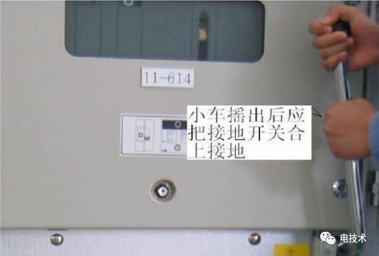 5.將接地開(kāi)關(guān)的操作手柄插入中間門(mén)右下側(cè)的六角孔中,順時(shí)針旋轉(zhuǎn)使接地開(kāi)關(guān)處于關(guān)閉位置。確認(rèn)接地開(kāi)關(guān)已經(jīng)關(guān)閉后,打開(kāi)機(jī)柜的下門(mén),以便維護(hù)人員可以進(jìn)入維護(hù)和檢修。