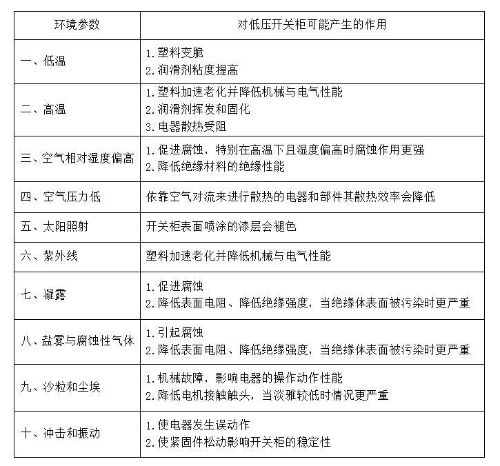 表1環(huán)境對低壓開關(guān)柜的可能影響