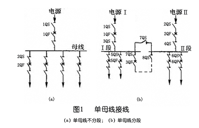 當有雙電源時,通常使用單母線段連接。如圖1(b)所示,可以使用隔離開關或斷路器部分。單母線分段連接可以分段單獨運行,也可以同時并聯(lián)運行。
