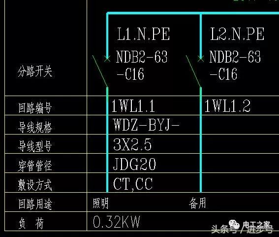 L1。并聯(lián)開關(guān)上方的N.PE指的是采用一路帶電導(dǎo)線,即三項中的一項,加上零線和地線,形成一個1WL1.1回路,電源電壓為220伏。導(dǎo)線規(guī)格WDZ-BYJ-3X2.JDG20-CT,CC指低煙無鹵阻燃交聯(lián)聚乙烯絕緣(銅芯)導(dǎo)線,3根2.5平方毫米,直徑20毫米的金屬管,橋架及沿屋面暗敷設(shè)。同時,標(biāo)記該回路用于照明和備用。照明負載為0.32千瓦,相對較小。