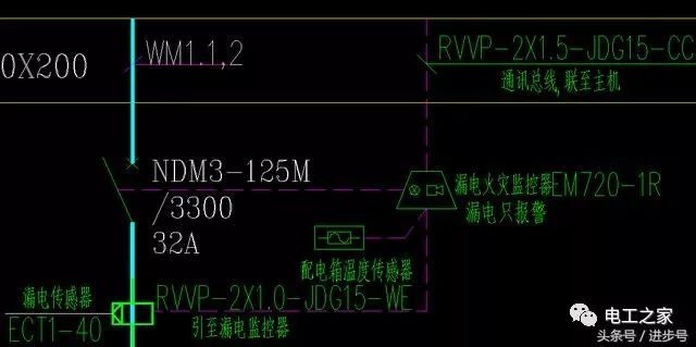 圖紙這一部分的信息量也相對較大,所以要盡量詳細。WM1.1和WM 2表是從1.1回路和1.2回路中得出的,上層的總照明配電箱。帶有附加電流32A的NDM125M/3300 32A斷路器;ECT40是一個電子傳感器。確切的名稱應(yīng)該是剩余電流互感器。根據(jù)以前的電流計算,選擇63A或100A的剩余電流互感器就足夠了。工作原理是檢測器火線和零線(零線)的電流矢量之和,以及電流損耗(即泄漏)的計算。配電箱溫度傳感器,是配電箱箱溫的檢測器,溫度檢測和泄漏檢測屬于電氣火災(zāi)監(jiān)控系統(tǒng)的標(biāo)準(zhǔn)箱。EM720-1R是一種電氣火災(zāi)探測器,用于向電氣火災(zāi)監(jiān)控設(shè)備(主機)傳輸泄漏信息、溫度信息和報警信息。使用rvp-2X1.jdg 1cc,即2X1.5平方毫米屏蔽軟線,天花板中隱藏一根直徑為15毫米的金屬管。