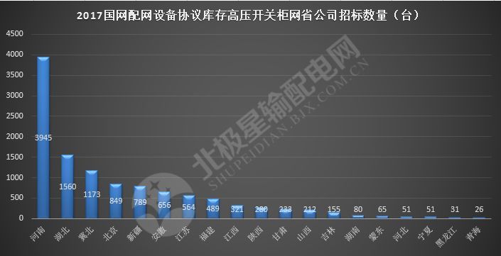 接下來,邊肖將帶您了解2017年配電網(wǎng)設(shè)備協(xié)議庫存高壓開關(guān)柜設(shè)備的國家電網(wǎng)省級公司的投標(biāo)情況。具體投標(biāo)數(shù)量見下圖。從圖中可以看出,河南的招標(biāo)數(shù)量最多,有3945個單位。河南、湖北、河北北部、北京和新疆是招標(biāo)數(shù)量最多的5個省,分別為3945、1560、1173、849和789個單位,占72.06%。此外,天津、山東、四川、重慶、上海、浙江、西藏和遼寧省四次未參加配網(wǎng)設(shè)備協(xié)議高儲存壓力開關(guān)柜設(shè)備的投標(biāo)。